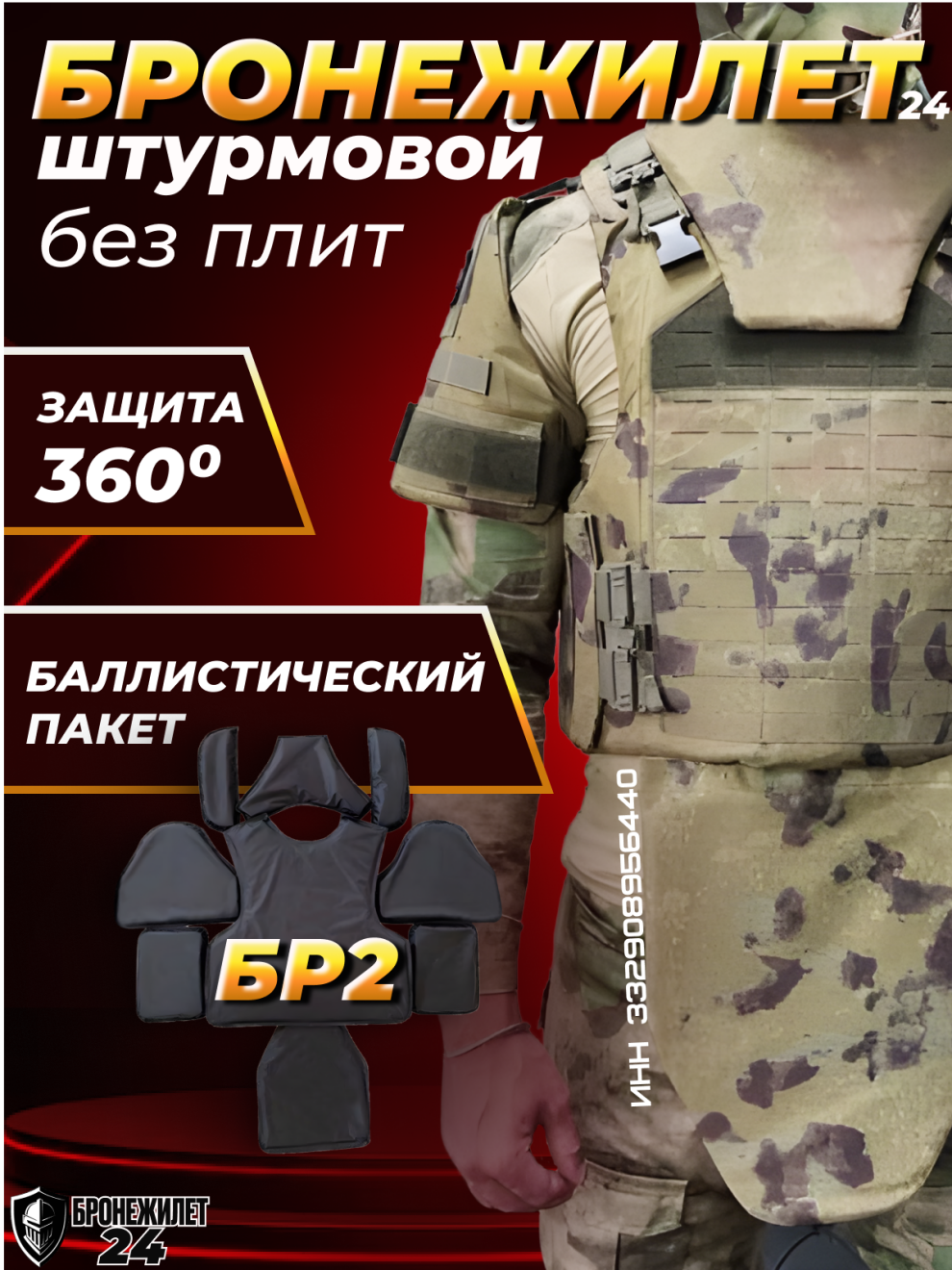 Баллистический пакет, состоящий из 36 слоев полиэтиленовой ткани, обеспечивает надежный уровень защиты БР-2. Общий вес комплекта составляет 11,2 кг. Бронеплиты SAPI в комплект не входят.